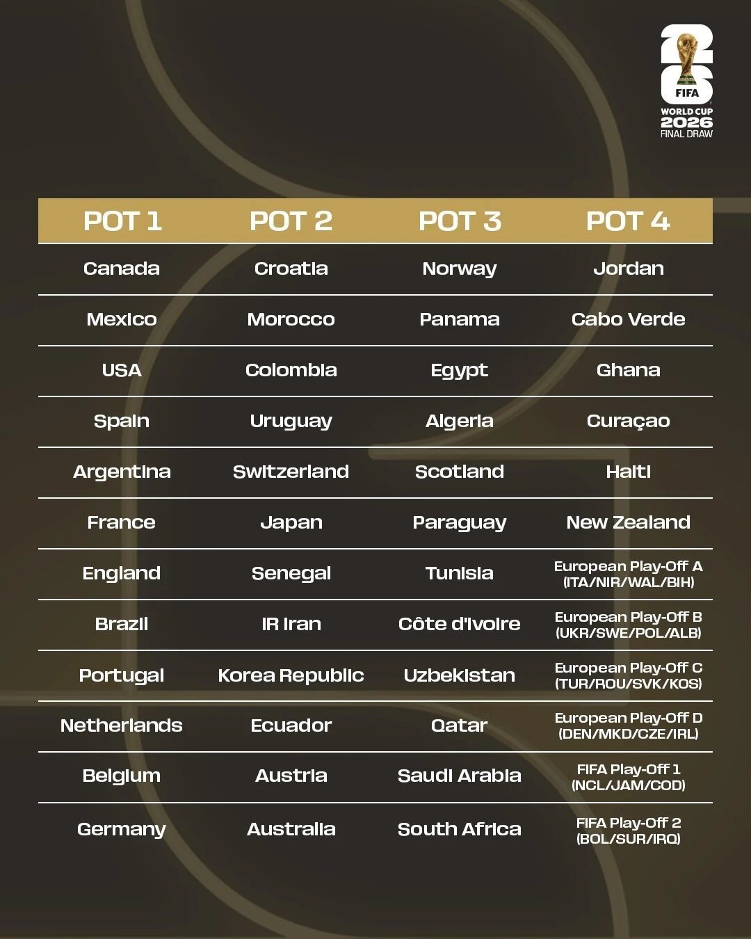 最后6个美加墨世界杯参赛资格将从洲际附加赛(2席)与欧洲区附加赛(4席)中产生。无论最终哪6支球队晋级,他们都已确定被归为第四档。
